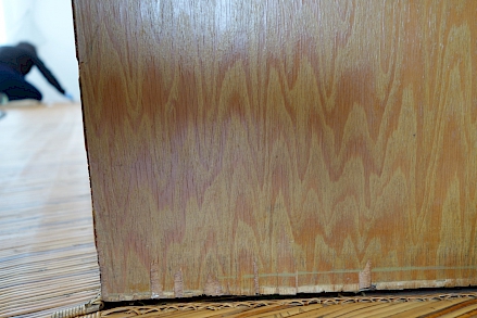 図3 損傷箇所 小上がり 2枚の敷物継ぎ目付近の合板。合板の下部が敷物にひっかかり剥がれた。