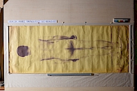 現在は丸筒に巻いて保存されているが、支持体全体に見られる横方向の変形の状態から、以前は芯材なしで巻かれ、展示に伴う移動や取り扱い時に掛かる荷直、支持体の劣化によるたわみなど、複合的な要因が加わり、折れやしわ、巻き癖が強くのこった可能性がある。画面、裏面共に汚れが付着している。裏面の下辺周縁部は、黄化、汚れが特に目立つ。長期間、外気や光に晒されていたことが窺われる。左右辺に2mm~20mm程の破れが数ヶ所にあり、裏面側に紙テープによる補強が施されているが、接着力が失われて外れている。左上角に10 cm強ほどの破れがあり、和紙で補強されているが、破れ口のずれの他、接着剤の濃度、水分量の影響によって、周縁に波打ち変形が生じている。本紙は展示を考慮したロールスクリーン型の仕様で、上下辺に展示用のアクリル板が取り付けられている。本紙との接続部分周縁も同様に波打変形やしわが生じている。人物頭部の上方に、裏面側に貼付されたセロハンテープが劣化し、黄変した接着剤が画面側まで及んだ暗い茶系のしみ痕があり、目立っている。上下片に取り付けられたアクリル板を覆う和紙の両端に破れが生じている。全体的に画面の色調は、経年による色褪せが見受けられる。